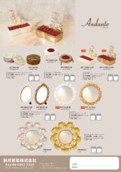 商品:家具、クリスタルガラス、ランプ、ウォールランプ、シャンデリア、ライト、時計、掛け時計、ウォールクロック、ミラー、鏡、フォトフレーム、キャビネット、カーテンタッセル、アクセサリーホルダー、ジュエリーボックス、トイレットペーパーホルダー、タオルハンガー、トルソー、コートハンガー、ディスプレイドーム、アクセサリースタンド、レース、ランチョンマット、カフェカーテン、テーブルセンター、コースター、エプロン、クッション、エコバッグ、ガラス、オブジェ、置物、オーナメント、グラス、コンポート、傘立て、シェルフ、フラワーベース、花器、花瓶、鉢、ポット、プランター、トリペット、壁掛け、ウォールサイン、ブラケット、キャビネット、テーブル、セラミックランタン、ポタリ―ケース、プレート、コイヤーマット、スツール、ダイキャストミニカー、LEDライトキャンドル、アンティークシャープナー